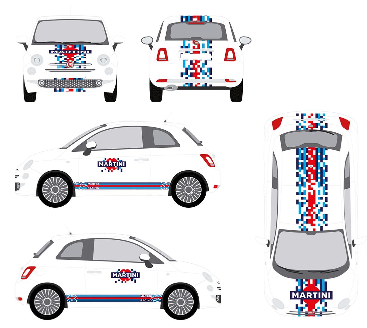 KIT DECO MARTINI PIXELS FIAT 500 - ABARTH Sticker Autocollant Racing Le Mans UNIVERSEL : adaptable tout type véhicule F5MART-PIXELS-WHT